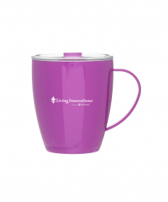 12 oz double wall 18/8 stainless steel thermal mug with copper vacuum insulation, clear acrylic push-on lid, and matching swivel; Hand wash recommended; Do not microwave; 4-7/16" h x 4"w (4-7/8 with handle) ; 355mL.