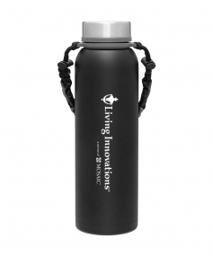 32 oz double wall 18/8 stainless steel thermal bottle with copper vacuum insulation, insulated stainless steel threaded lid, silicone ring, removable strap with buckles, removable clasps, and powder coated finish. Individual gift box. Hand wash recommended. Do not microwave. Complies with FDA, Prop 65. 11" H x 3.1875" W